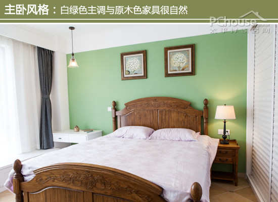 设计师建议:在炎炎夏天,把白绿色放在一起,瞬间会有一起清凉的感觉袭来。卧室的这两种色调搭配起来,让住在南方的人倍感舒适。床体与挂画的风格是与主色调完全相反方向,虽说MOMO当初也对这种颜色心里没谱,但原木色系放在绿色墙边就有种在绿色森林里游走的感觉,绝对不是完全的相悖。这种设计也得到了MOMO朋友的肯定。