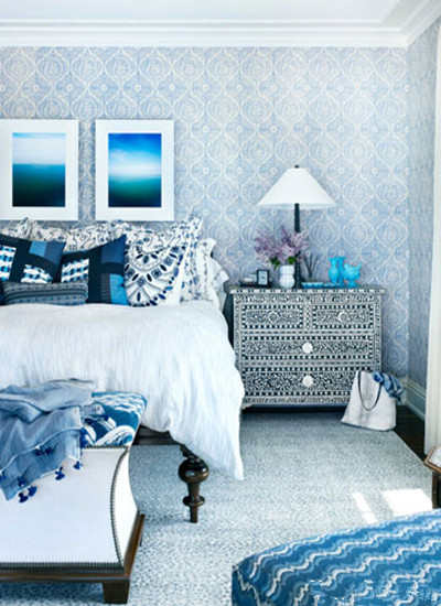 编辑点评:样式到处都有体现——来自乔安娜的波斯墙纸包装着主人的卧室。这个密歇根湖住宅是由马丁·郝耐尔设计的。绣花枕头的上部的靠枕是杰德约翰逊仿制的,来自琳达奥康纳公司。它们将来自罗伯特简约的西姆雪橇式床突出出来。紫藤柜子是两用的,夜间可以做床头小桌。