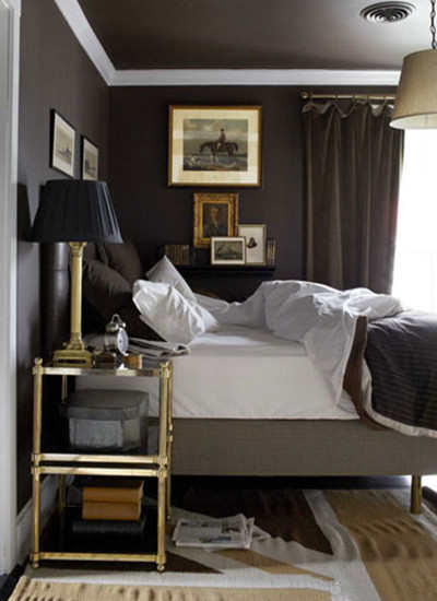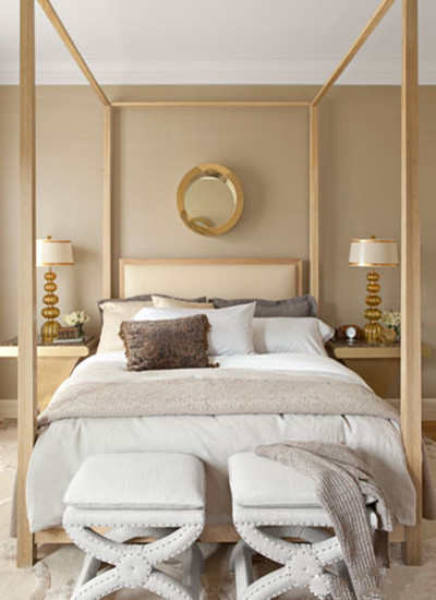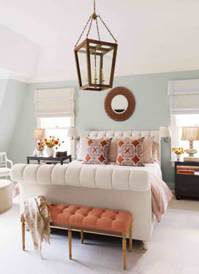 编辑点评:为了给一间旧的康涅狄格格林威治的卧室增加效果,设计师李·安摆设了亚麻的桔色沙发Tuska,是从马拉巴尔购回的。靠枕上的约翰·罗伯肖的绘画强化了橙色主题。床是从Lulu DK的斯特拉砂买回的。灯笼和床头柜来自于Mecox园林。