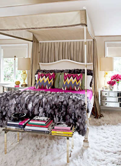 编辑点评:设计师马丁·劳伦斯设计的有天篷的床,设计灵感来自贝比·佩利的床的启发,他的阿德拉斯绸伊卡特印花枕是粉色,黄色和蓝色的调和。