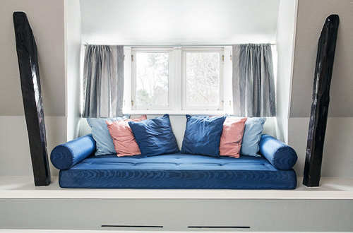 编辑点评:蓝色的坐垫以及靠垫组成了这个沙发,置于窗口仿佛“王座”一般,而蓝色的外观在一片白色的大环境中显得非常显眼,增添了不一样的元素。