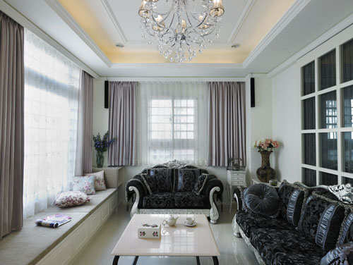 简单的线板设计串连电视柜及窗边卧榻。位于一楼的客厅拥有两个光面的亮度,线条繁复的黑系古典沙发置于白色格栅窗前。