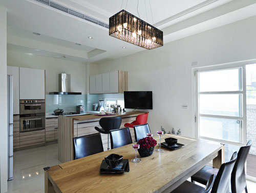 从洁净大方的客厅到餐厅,转为红色的温暖砖墙,中央搭配镜面线条的拉门,隐藏卫浴及储藏室。