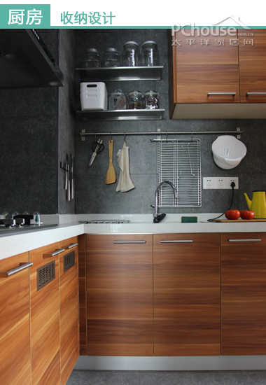 厨房:厨房选择木制橱柜,空间收纳井井有条,墙面的空间也是充分利用,挂钩和搁架很好的收纳了厨房的小厨具,墙面使用了灰色的仿古瓷砖,易于打理。