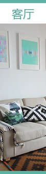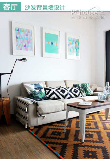 客厅:白色的墙面显得过于单调好刺眼,在沙发背景墙上挂上了阿诺自己创作的三幅画,而且画的图案和靠垫、地毯、餐具形成很好的呼应,让整个空间的风格显得更为协调统一,色彩也更加丰富。