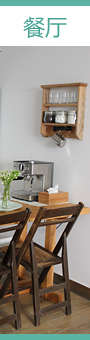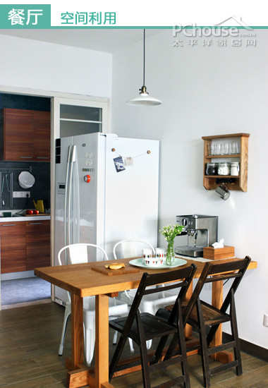餐厅:进门左手边便是餐厅,利用空间的一个小角落,摆上桌椅,小小的餐厅就形成了,非常简约。对于小户型来说,这样的设计很适合,不暂用过多空间,而且又显得简约温馨。