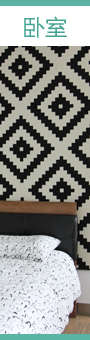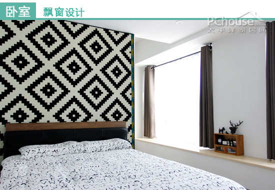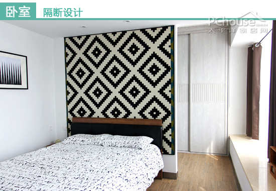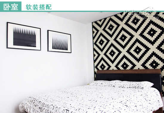 卧室:卧室总体风格较为简练,以黑白色为主。背景墙图案采用客厅同款地毯图案,风格保持一致。