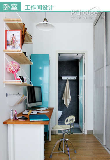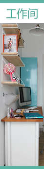 工作间:这个空间较狭小,放置一般的书柜会使空间显得拥挤,所以就定做了一个书桌,墙面上挂了木质搁架,用来收纳,而且不占用通道空间。天蓝色铁皮柜让工作室色彩显得更俏皮活泼。