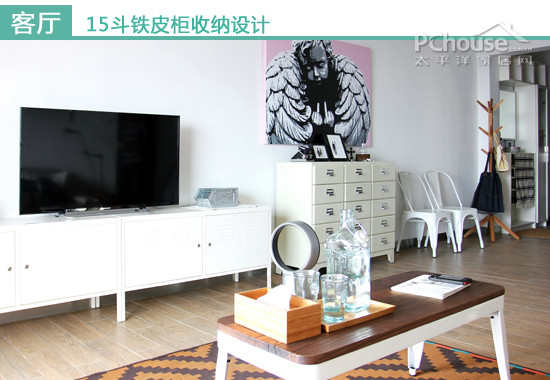 客厅:15斗铁皮柜和装饰画作为玄关步入客厅过道的装饰,衬托全屋装修风格,而且体现了主人的个性,铁皮柜正好可以收纳平常一些生活用品,又可以分类。