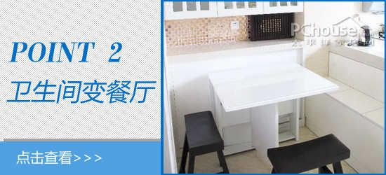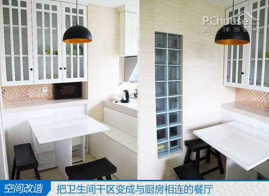 空间改造:把原户型卫生间的干区分出来,与厨房相连,形成一个小小的餐厅。厨柜作为明显的隔断,同时也是餐厅的一部分。白色餐厅与黑色餐厅相间,颇有现代气息,干净利落的设计增加食欲。餐桌虽显简单,但它不用的时候是可以折叠收起的,不会占用空间。