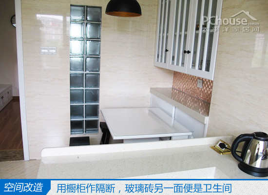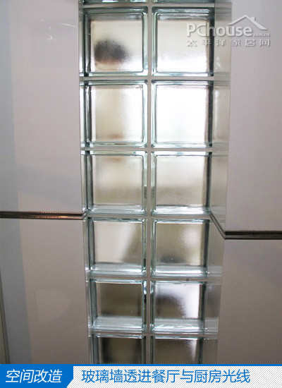 空间改造:卫生间相对封闭,为了采光,把与餐厅相连的一面墙,做了竖排玻璃砖,透进餐厅与厨房的光线。
