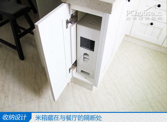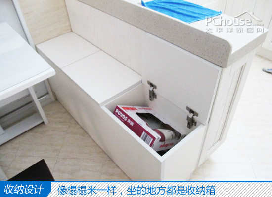 收纳设计:与厨柜相连的餐椅是一个神奇的收纳柜,与榻榻米原理相同,打开之后,里面是一个百宝盒,可以装下很多东西。