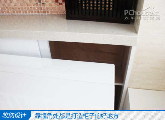 收纳设计:餐厅的墙角也丝毫不浪费,打造一个玻璃收纳柜,下方是一条缕空带,用马赛克砖分区,下方是一个推拉门柜,整一面墙都是收纳小天地。
