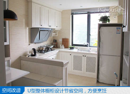 空间改造:U型整体厨柜设计适合小户型使用,主妇可“左右开工”,其中一面柜子是与餐厅的明显隔断,JOJO在这里已经有开放式厨房的初步理念。水槽正对窗户,采光极好。冰箱也有了自己的小天地,不受旁边水槽的水汽影响。JOJO说厨房有点西晒,特意给冰箱做了个柜子保护它,考虑到散热问题就没有做门。