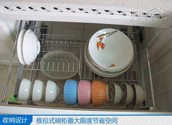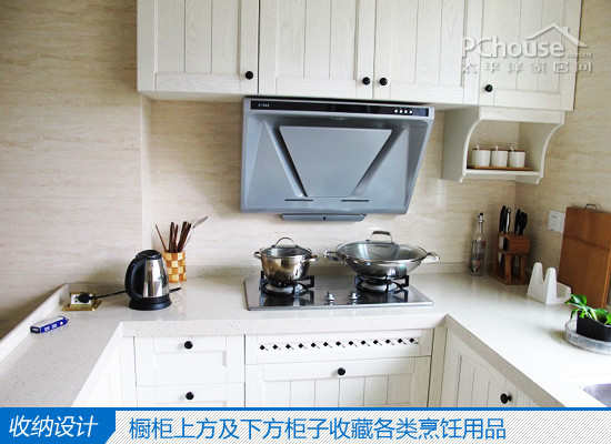 收纳设计:U型整体厨柜上方与下方的收纳空间极大,推拉式碗柜镶嵌在柜体内,使用方便。