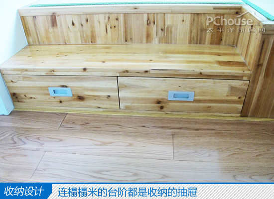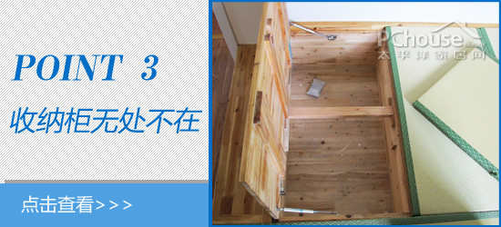 收纳设计:榻榻米分为9个大格子,每一格榻榻米下方都是储物空间,甚至榻榻米的台阶也做成了抽屉。还没有挂上的电视机,位置预留在与玄关相连的那排柱子上。