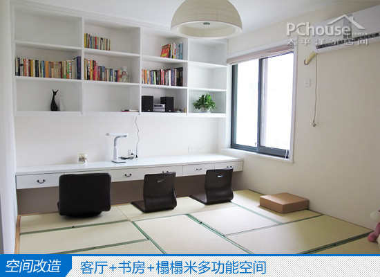 空间改造:客厅面积太小,业主大胆地做了一个榻榻米设计,一面墙作为书架使用,书架做了12格,下方留着工作台的空白带。客厅中部使用圆形蚕丝灯,为整个多功能空间造光,百叶窗调节自然光线。