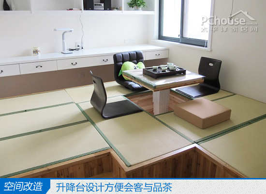 空间改造:右上角的格子里藏有升降台,小靠椅可根据使用自由移动,方便品茶与会客;据业主介绍,榻榻米台高35cm,绿色草垫高3.5cm,适当的高度加上木质设计,不影响孩子上下的安全。