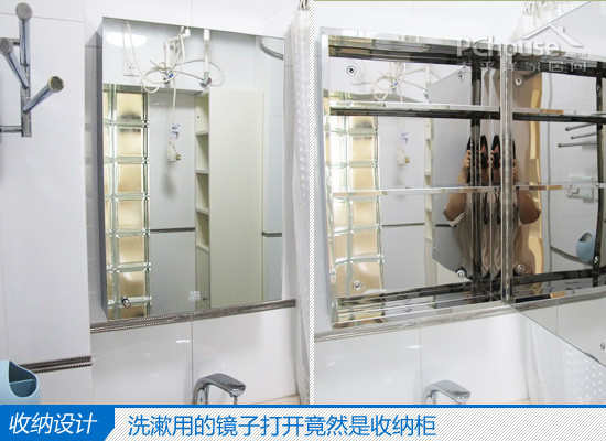 收纳设计:千万另忽略了洗手盆上方的这块镜子,打开是一个洗漱用品的收纳柜呢!