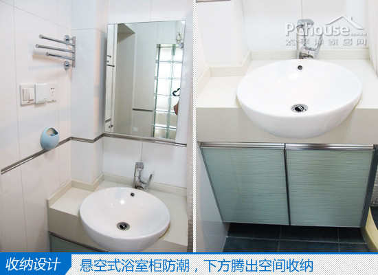 收纳设计:沐浴区墙角放置沐浴用品;水槽左侧毛巾架、插座、纸巾盒一应俱全;悬空式水槽柜防止潮湿,柜下方又有空隙放东西。