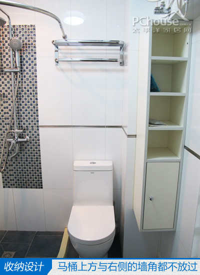 收纳设计:马桶上方与右方的墙角收纳也不放过。卫生间有什么东西都能藏得住了!