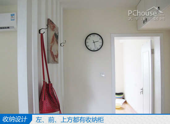 收纳设计:从玄关另一个方向看,会发现玄关顶部也是三联排柜子,收纳一些不常用的物品。