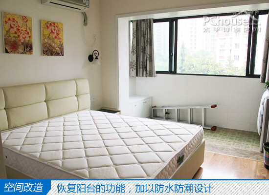 空间改造:阳台增加了洗手池,装修时换了窗户、做了防水、贴了磁砖,应对杭州湿热天气,显得实用多了。窗户高度足够,旁边没有高楼遮挡,主卧采光一级棒!虽说没有风格,但JOJO还很心思地在主卧墙上用挂画来修饰。