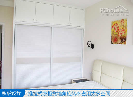 收纳设计:进卧室左手边是一个移门式衣柜,上方的柜子放置换季被褥,下方放置常换衣物。