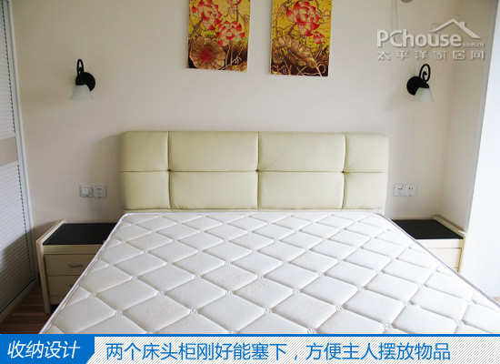 收纳设计:由于衣柜是移门式,可以省却不少空间,让主卧床头两端都可以放置床头柜。床头柜上方都有壁灯,用于夜间照明。
