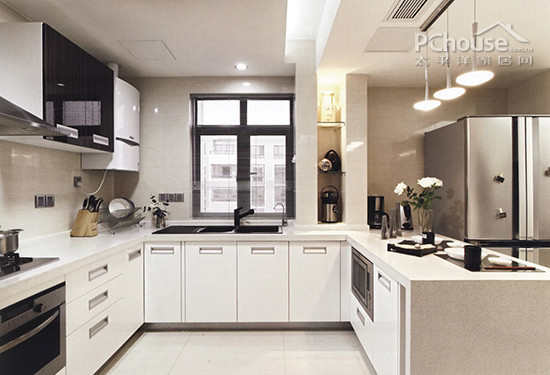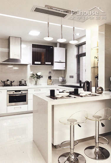 2、小厨房,加上不规则的造型会让人觉得很压迫,改成开放式,连在外面的吧台,会更加亲和!