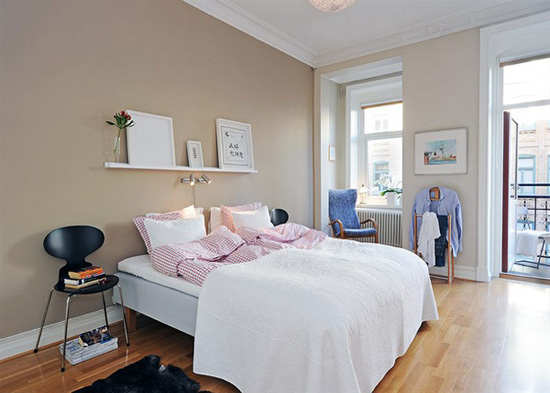推荐理由:在床头的墙面上钉上一小块隔板,放上鲜花、简单的装饰画,使得卧室环境温馨优雅。