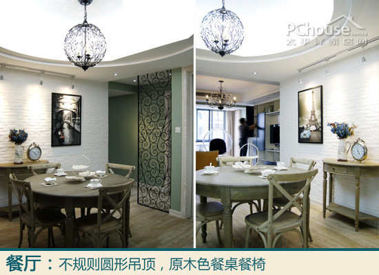 我喜欢的设计:看到那个吊顶了吗?外层正圆包裹着不规则的圆,里面藏了灯源,吊灯的造型是开开鼓励我尝试的风格。餐桌、餐椅、边几都统一用有点泛旧的原木色,整个餐厅看起来,法式感觉很浓重。