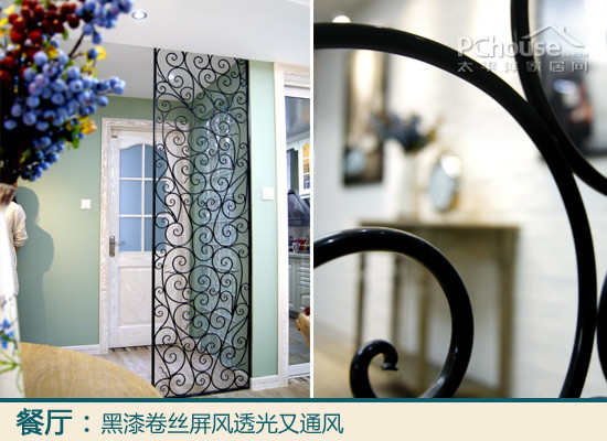 我喜欢的设计:很多卷丝状的屏风后面是客卫,总不能让厕所门对着餐厅吧!开开说那个角落本来就很暗,不宜用全封闭的屏风,这种镂空设计既不阻挡视线又透进餐厅光源。