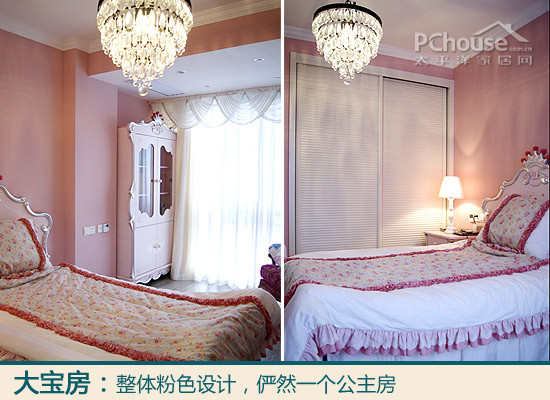 我喜欢的设计:整体粉色的墙面很协调,吊顶用了白色,吊灯继续是亮瞎眼的水晶灯。床背用了法式的卷边设计,特意给大宝准备了这套粉白相间的床被,跟房间风格很一致。进门左侧是推拉式衣柜,很省空间。柜和床之间的空隙可以放下床头柜,都是粉嫩的颜色。