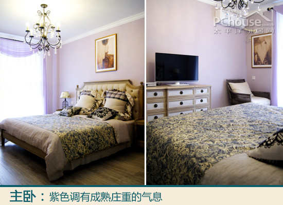 我喜欢的设计:原木色床架、原木色的电视柜、木质地板,好像是一套设定似的。我名字里有“紫”字,也是紫色控,主卧背景墙直接就上了淡紫色。