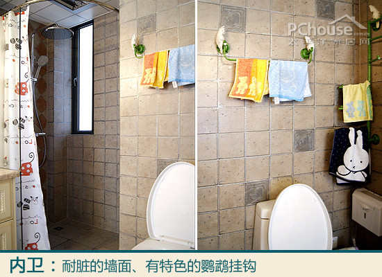 我喜欢的设计:小小的内卫弄了干湿分区,干区设在角落里,有个小窗通风,没有用玻璃门分隔,两夫妻拉上布帘就可以了。马桶的角落装了鹦鹉装饰挂钩,挂挂擦手布。内卫墙面和地面的楼兰砖都是耐脏耐滑的。