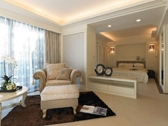 编辑点评:越过电视柜来到主卧专属的起居空间,可以独享一人自在时光。