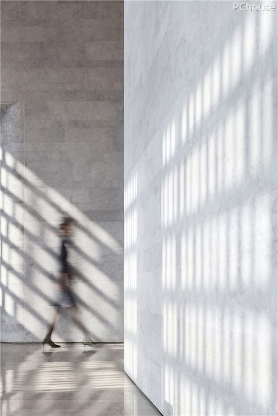 如同把一块建筑拆开再重组,走廊虽然仅是过渡空间,却保证了空间功能和动线的拆分,也塑造了视觉的停顿和节奏感,大堂格栅引入的光芒延至墙身,光线在空间之中流穿,以丰富的层次奠定了空间平和温润的基调。