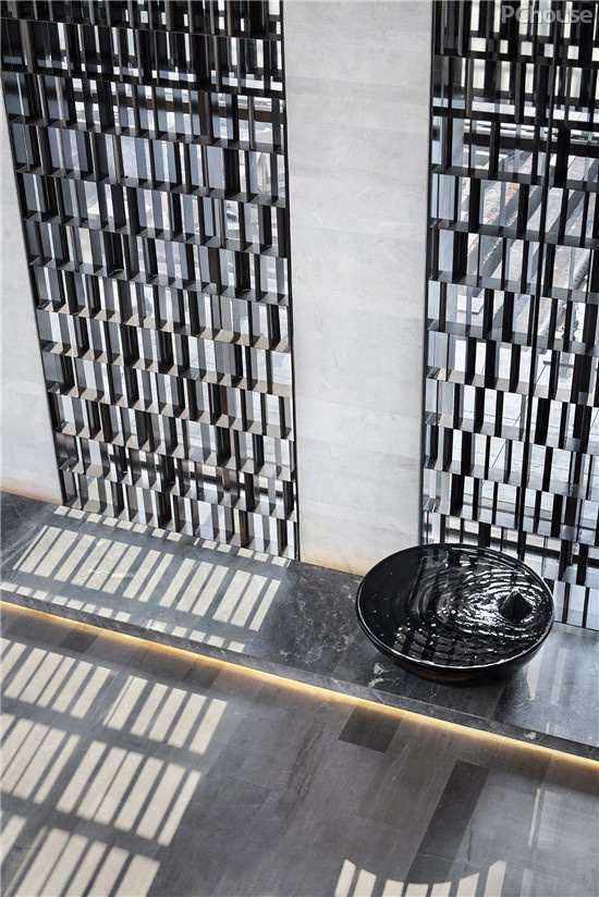踏入迎宾空间,高挑空的大堂,气势恢弘,干净无痕的理石墙面,沉稳而不孤冷,与镂空黑色格栅,共同围合出一处空且灵净的美学殿堂。光影交落,沿着时间变化,组成撩动人心的细腻语言。而水境的介入,不论是淳淳流水的形态,或粼粼波面的意境,均弥漫出淡淡的余韵与清气,让人的步履随之变得闲缓、宁静。