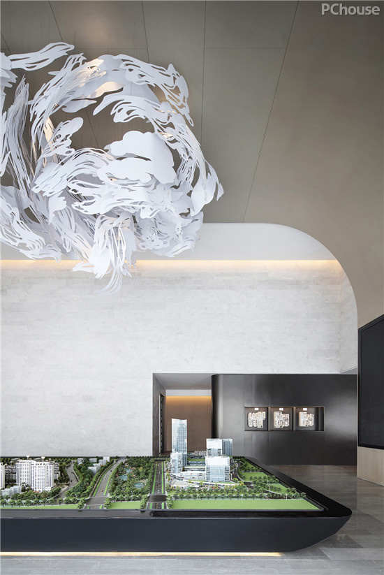 洽谈区是售楼部的重心,开放、流动的手法糅合充足的采光,空间用色干净、简约,但有着明确的层次。在动线设计的考虑中,除为人而服务,亦需要为视觉开敞路径。中轴线向内,视线可一眼望去,以圆做为视觉终点,石墙的直落线条与金属装置带来的弧度产生的对比,在矛盾之中却为视觉路径的创造停留点。