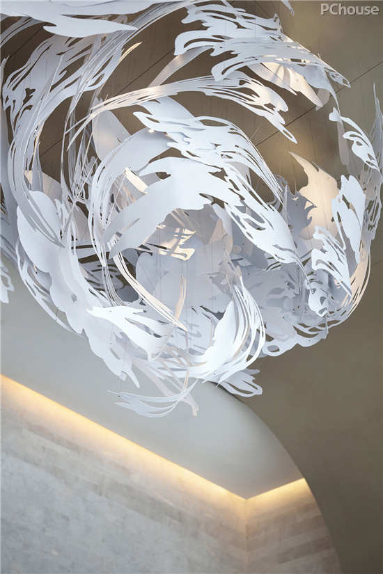 建筑本身以不同材质组合,形成了硬朗体界定的桎梏,而艺术装置“云穹”的盘踞,通过与自然光、自然景的营造,白色给予人们更多的感官体验帮助扩展人们对新事物的接纳度,同时消化了建筑本身带来的重量感,内外界限消弭,为转入后场提前铺设。