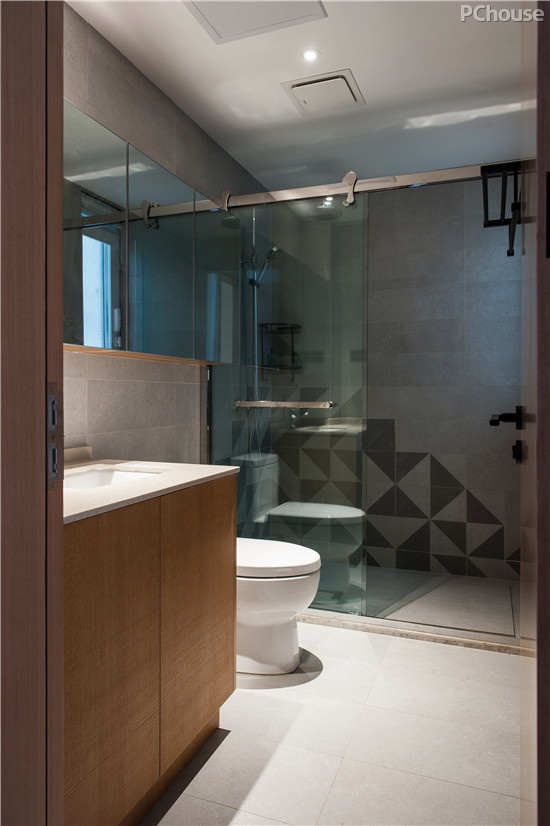 书房和浴室一墙之隔,我们用部分玻璃做了隔断。让空间有了互动和通透性。