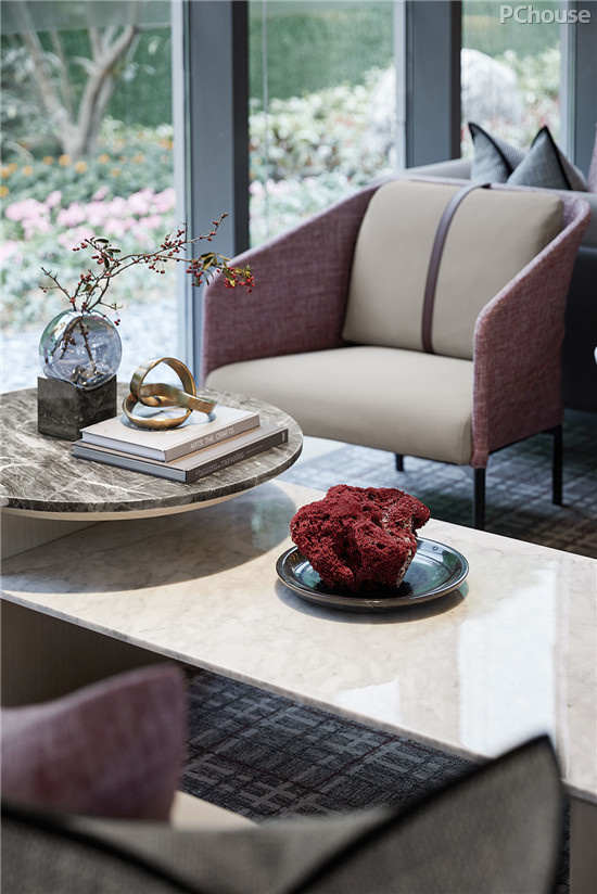洽谈区的硬装部分以大面积的木质和大理石为主,设计师应势而为,在自然色系的基调中,加入了中国传统颜色——绾色。绾色也称浅绛色,温婉雅致,当古典色彩融入现代风格,一丝暖意悠然而生。