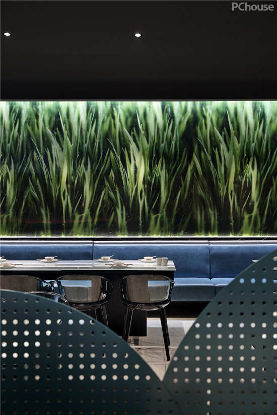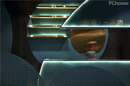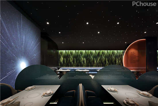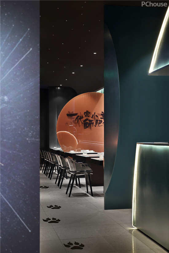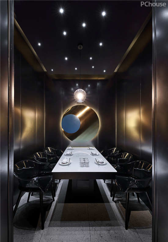 空间中圆的应用很抢眼,这转化自月亮的圆形,在多变星光氛围的烘托下,皎洁的月,恍如梦境。同时大圆也呼应了餐桌上的圆形火锅等器具。