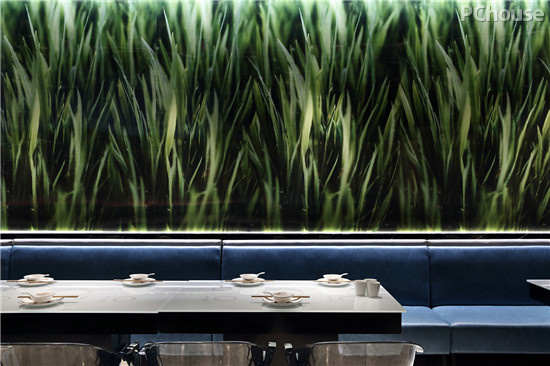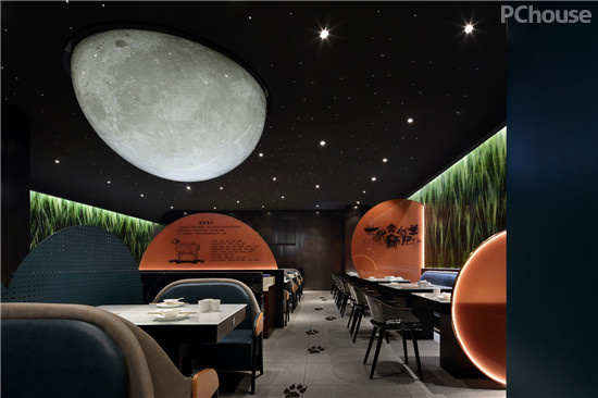 追随狼的足迹进入餐厅,寓意夜空的天花上繁星点点,大满月悬挂半空,瞬间给人开阔之感,只走了几步就进入了星夜草原世界。