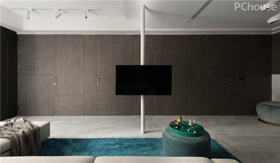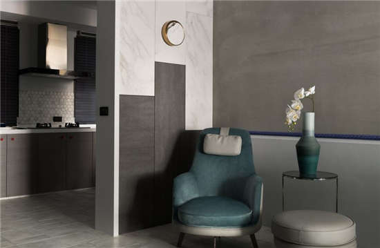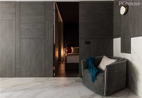 通往卧房的转角立面,恰到好处地侧向延展棕黑木质,而其下则将地砖化为墙垣,既拉伸视觉,亦与相临角落形成上下对调的用色巧思。