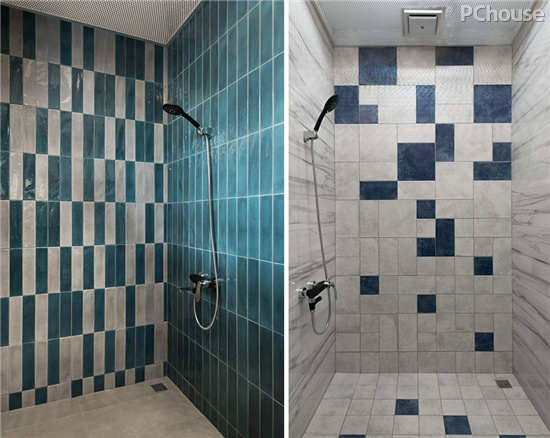 另外两间卫浴与前者不同,运用鲜明的几何元素,创造俄罗斯方块般的视觉趣味,为洗浴过程增添乐趣。