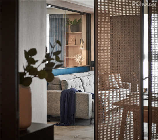 在起居区与书房之间,设计师巧妙设置L型木作边框,增加空间层次之余,更与书房陈设相应,塑造宛如镜射的对称画面,强化两处机能场景的互动对话。