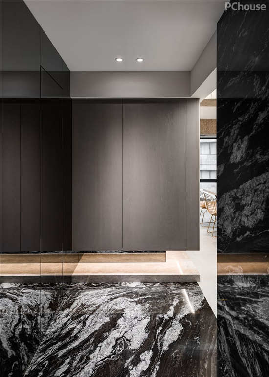 【太平洋家居网 设计频道】村上春树曾说过:「仪式是一件很重要的事。」作为办公空间的名片,玄关是予人第一印象的场域,因此我们特别选以雕刻黑的花岗大理石铺垫入氛围,除增添推门入室后的仪式感,更为接下来的步伐递增期待。