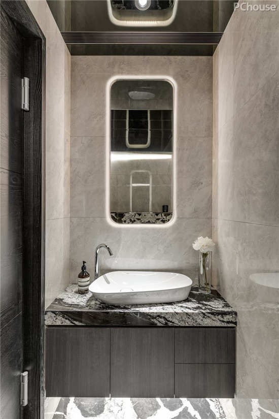 临侧的卫浴空间,同样延续此低奢光氛,仅仅是空间的一隅,却满是细节的铺陈,大理石纹壁砖的柔和质调,在镜面光源透射下,让空间向度获得延展。